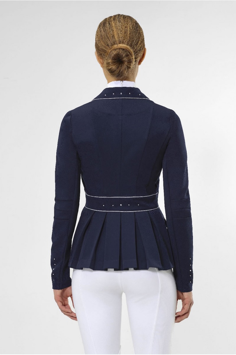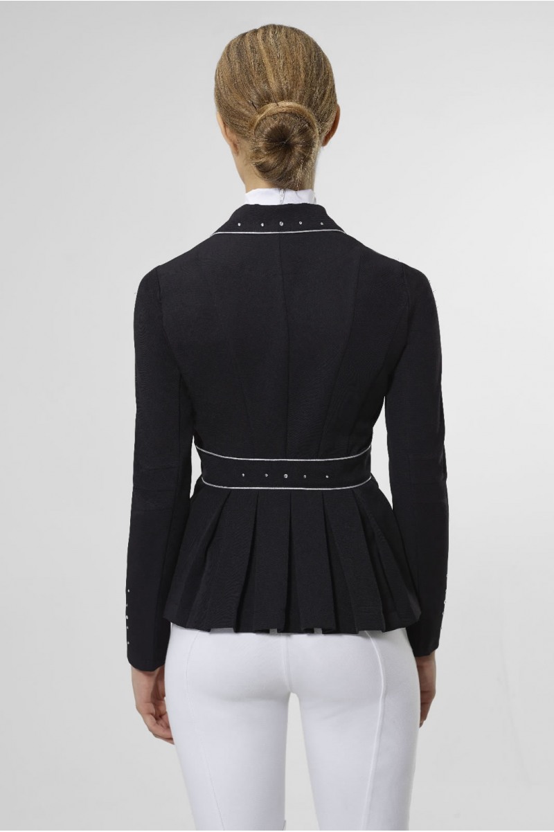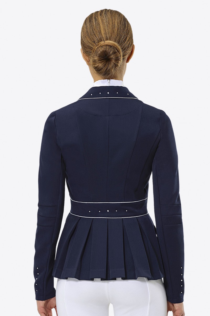 • Cavalliera professional Turnierjacke für Damen und Mädchen, mit weiblichen Schnitt und einzigartigem Faltenboden aus 8 verschiedenen Abschnitten auf der Rückseite für den perfekten Slim-Fit-Effekt. Verziert mit silbernen Paspol am Kragen, an den Taschen und Gürtelimitation auf der Rückseite sowie feinen Kristallen. Verfügt über vier silberne Knöpfe.