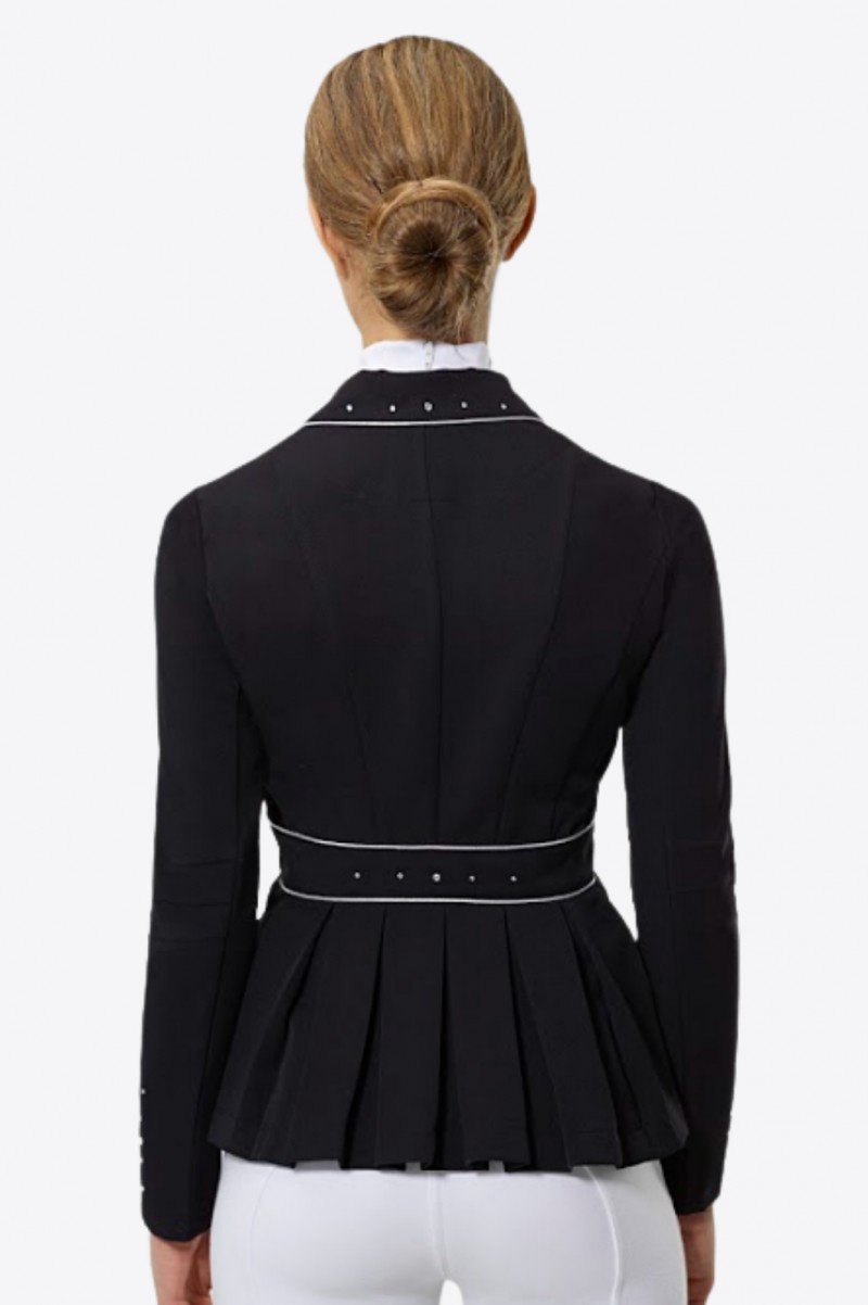 • Cavalliera professional show jacket for women and girls, designed with a feminine cut and unique pleated bottom, made out of 8 different sections on the back for the perfect slim fit effect. Decorated with silver piping along the collar, on the pockets and belt imitation on the back as well as fine crystals. Features four silver buttons.