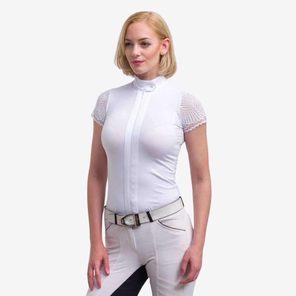 Confeccionada con tecnología especial de doble faldón con detalles en su diseño que garantizan una gran libertad de movimientos. La tecnología de doble-frontal asegura que los jinetes tengan siempre un look elegante y ofrece un ajuste personalizado superior. Decorada con tiras traseras de cristales brillantes para una apariencia lujosa. Su corte entallado es muy atractivo, único y femenino; las curvas y líneas se han estudiado cuidadosamente para que la libertad de movimientos sea óptima durante la monta. Con perfiles en color gris claro a lo largo del cuello, el cinturón y los faldoncillos.